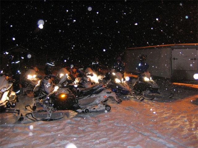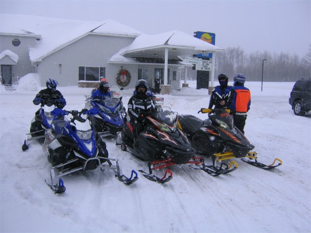 This year is coming to a close and with that comes the TY Demo appreciation ride. The snow was deep, the tails were fairly nice and the people were the best!! As the snow was falling Thursday eve and I dredged my way to Munising at 25 mph in near white-out conditions with the Yamahas Demo team on my tail, I thought about how fun this weekend is going to be. I was right.. it was a BLAST… The demos rides Friday morning got off to late start as the Yamaha trailer could not push on thru the storm. They funneled as many riders as they could that afternoon and picked it up again on Sat to finish out demo session before opening it to the public. Since we had time to kill on Friday morning, we headed out for a ride with Rob from Yamaha. Terry (NOSPro) was kind enough to let him use his spare sled. Friday eve we headed out for dinner at Foggys with the Yamaha Demo team and Rob from Yamaha; Big thanks to Rob for dinner. After returning from dinner, Rob brought the 08 FX Nytro to the heated garage. We all had a chance to get close and personal with that bad boy….. Awesome!!!! It was unreal of Yamaha to allow us to be able to experience something like that. Sat after the final demo rides, we broke off into groups. Some went off trail and some of us head south to the Jack Pine for lunch. Finished out Sat with some great trail riding and headed in for some dinner at Sydney’s. At Sydney’s we had a great turnout with 40 people including the Yamaha demo team. We all wished RichieRich happy B-day with a surprise sundae and a nice big happy b-day song….then onto the garage for more entertainment to finish off the trip!!!
