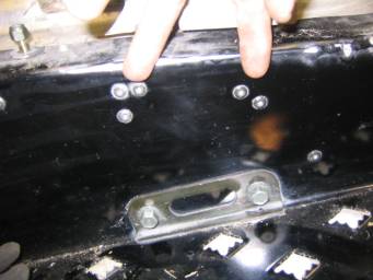 Lift up the rear of the M-10 and align the holes in the plates with the new locating holes drilled earlier. Install the original factory bolts to secure plates into tunnel. Install the 10-23 button head bolts and nuts provided into the rivet holes drilled out earlier.
