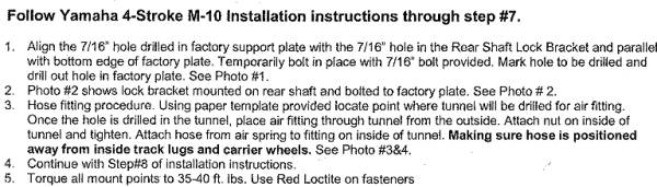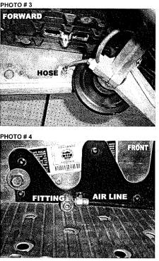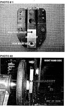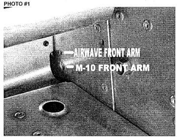 Install front M-10 arm into the new locating holes drilled in tunnel. Using the 7/16” Allen bolts, lock washers, and flat washers provided torque to 35 lbs. The turned out upper edges of the stock front brackets need to ground flat for property fitment of front M-10 shaft. See photo #6 (BE SURE FUEL VALVE IS OFF).