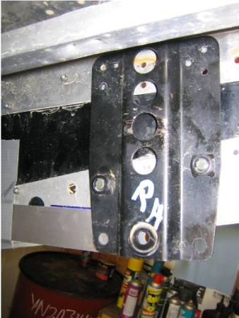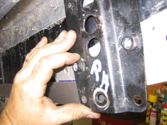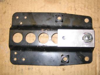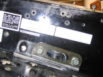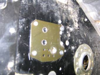 Starting on the inside of the tunnel on the left hand (LH) side located the stock rear suspension mounting plates (black in color). Label the plates LH and RH do be sure they go back on the correct sides of the tunnel. On the outside of the tunnel remove the two lower bolts that hold the plate to the tunnel. Then drill out the rivets that hold the upper portion of the plate to the tunnel. See Photo