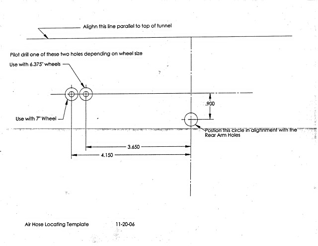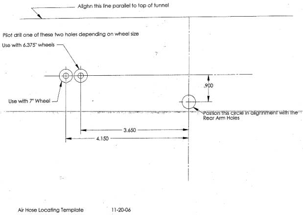At this point I took the small black tunnels supports provided by Fast and drilled the same 29/64 hole thru one of the many holes that best suited for my installation by putting the plate over the predrilled tunnel hole, I could then see what tunnel rivets would interfere with the plates and notched or drilled additional access to allow the plate to sit flat in the inside of the tunnel. After front supplied support plates have been modified, bolt the plate in place with provided front mount bolt and nut. Be sure the top of front support plate is parallel to top of tunnel. Mark the four 3/16” holes in the four corners of the plate and drill through tunnel. Rivet into place. See drawing #1. Apex RT & Apex GT use different tunnel bracing inside tunnel which may involve trimming the front M-10 plate to fit accordingly.