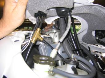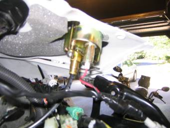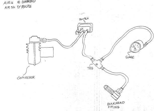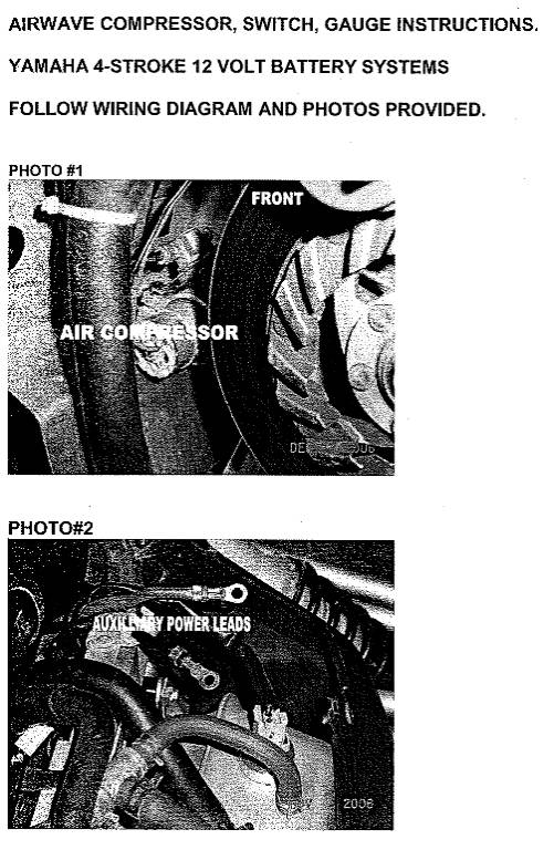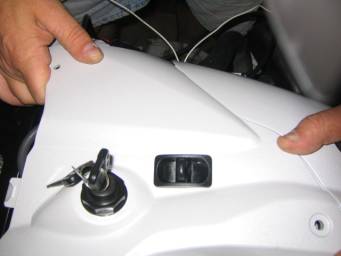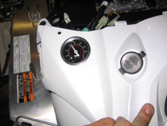 The following pics are the actual areas we selected for the compressor mount (near the oil tank), the switch and gauge mounted into the access panel between the handle bars and the gauge pod.