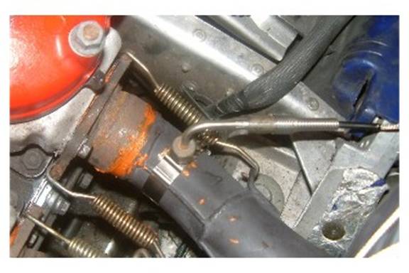 To install the egt’s into the pipes, place the clamps 2” to 3” from the cylinder and tighten them down. Using a 3/16” drill and the clamp as a guide, drill through the pipes. Then remove the clamps and open the holes to1/4” using a drill. Place the clamps back on the pipes and tighten them down. Install the probes so about ½” is in the pipe and tighten the nut. Route the wires alone the pto side of the sled and run them up the hood to the harness that goes to the gauges. I put the pto and center on the left gauge and the mag cylinder on the right with the tach. I used some insulation to cover the wires as they went over the pipes.