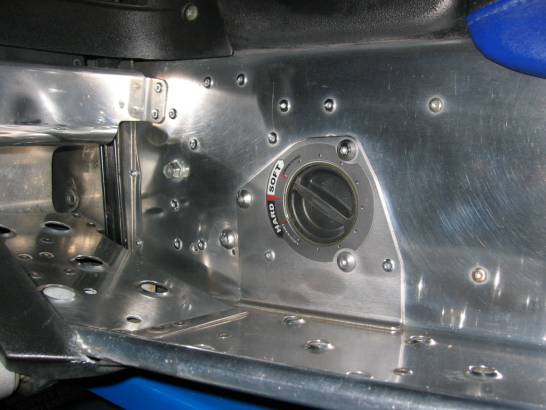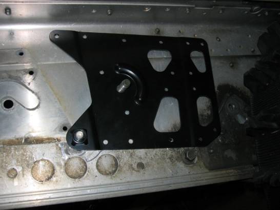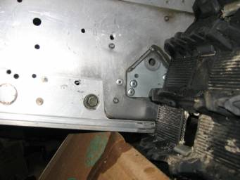 Now you need that dial adjuster in there to take advantage of the easy adjustment of the Mono. This part seemed really straightforward. Take the mounting plate that mounts on the outside of the tunnel. Set it up and eyeball it to make sure that the rivets will clear the mounting brackets for the skid itself. Drill the holes for the two rivets on the plate. Rivet the plate to the tunnel and use it as a template for the three remaining holes for the screws. With a nice SHARP hole saw and using the plate as a template, drill a hole for the dial adjuster. I used the Dremmel to make the hole edge smoother and a tad bit bigger. Place the dial adjuster in the hole from behind and mount it with the screws. Now hook up the cable to the shock and BE SURE IT IS ON TIGHT!!! I also learned the hard way on this one and the cable fell off while I was riding. It then caught in the track and got chewed up pretty well. Not fun, or cheap.