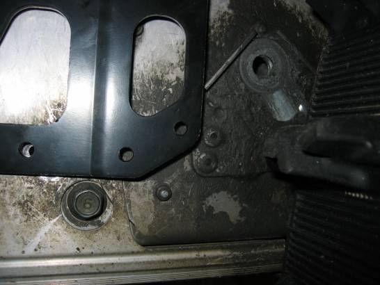 I first drilled out the rivets on the original front bracket. They can be seen in the pic below. They are the holes that form a triangle around the middle mounting bolt hole. I also ended up needing to drill out the holes that hold the top of the foot-holds in, as well as whatever else wouldn’t clear the new brackets. more on that later.