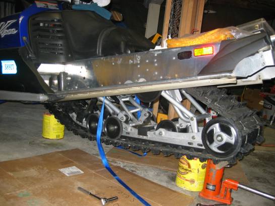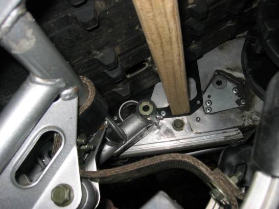 Next you will need a piece of wood cut 16 ˝” long. I used a piece of wood left from a deck railing and it worked out perfect. You need to wedge this into the tunnel above the bracket to spread the tunnel slightly to allow you to slide the new skid in. This is due to the fact the new brackets are taller than the tunnel and are actually installed sideways. This means there is a lip you need to clear that wouldn’t be in the way on an apex with the bracket installed upright. I have since been told it might have been easier to trim the new bracket. Maybe so, but this is how I did it and you can choose either way!