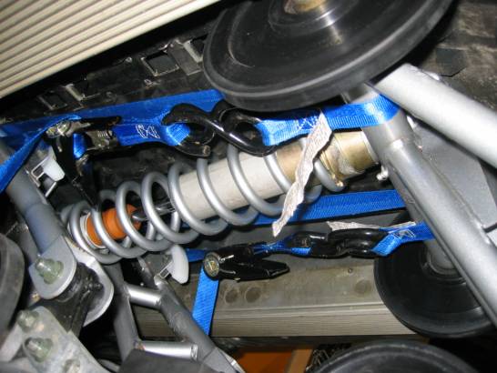 I then used a couple ratchet straps wrapped around the skid to compress the shock. I have been told that you can also undo the transfer rod to get the tension off so the rear bolts line up with the holes. Whatever works for you and makes you happy.
