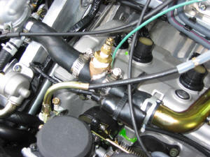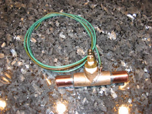 Next you will need to add the Tee in the coolant line for the sending unit. You will need to either solder a wire onto the Tee or find another way to ground the Tee. I just laid a wire on the Tee and soldered it on. I also soldered in 2 pieces of Ύ copper tubing into the ends of the tee. I did not feel safe just putting the coolant line over the ends of the Tee so I added the copper for a little more surface area. This is not necessary as many people have done without it just fine. Also you will want to install the ½ adapter and sending unit supplied with the gauge into the Tee. Be sure to use Teflon tape on the threads so it does not leak.
