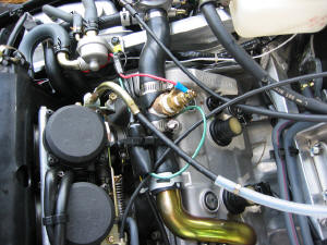 Finally, run a red wire from the gauge post marked S, down the hood and up the frame following the factory harness and across to the sending unit on the Tee. Connect this wire to the top of the sending unit using an appropriate wire connector.