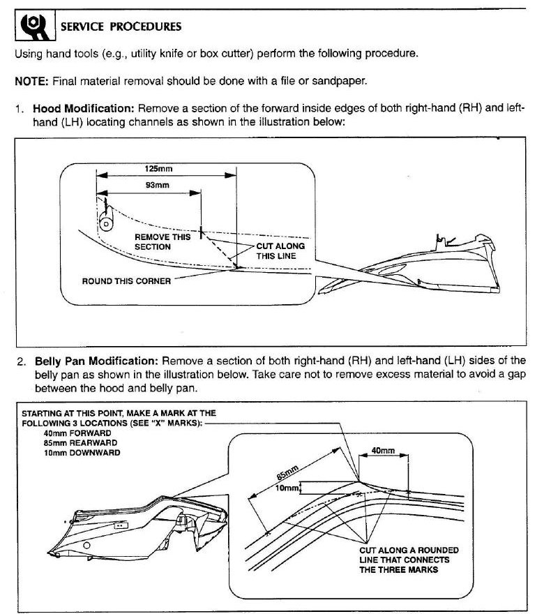 Tech Tip: The new viper hood has a bulletin concerning inside lip (hood stay) See Above. Problem is it cracks, then does not keep hood just right and pops out in the center. Their fix is to snap it off and modify the belly. Mine started to crack more than half way off. I put hot glue on both inside and out of that tab, hope it works . I think that would be a great preventive step. Don't be shy put it on thick on the outside of the tab then remember the inside needs room for the belly pan. The hood comes off real easy, the best way to get a good working position. Some people may try to use other material to fix this like plastic weld or epoxy or even some type of silicone, but I liked the hot glue. Ask your dealer about this if your not sure what to do.