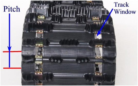 · The best way is to calculate the length of the track by determining the pitch of the track and multiplying that number by the number of windows or spaces between the lug patterns. The pitch is the center of one drive window to the next as shown in the attached photo below.